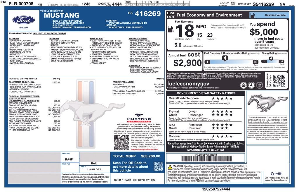 2025 Ford Mustang GT Premium Molten Magenta Metallic Tri-Coat 5.0L V8 Ti-VCT 2D Coupe