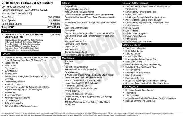 2018 Subaru Outback 3.6R AWD Wilderness Green Metallic CVT Lineartronic 3.6L Boxer H6 DOHC 24V