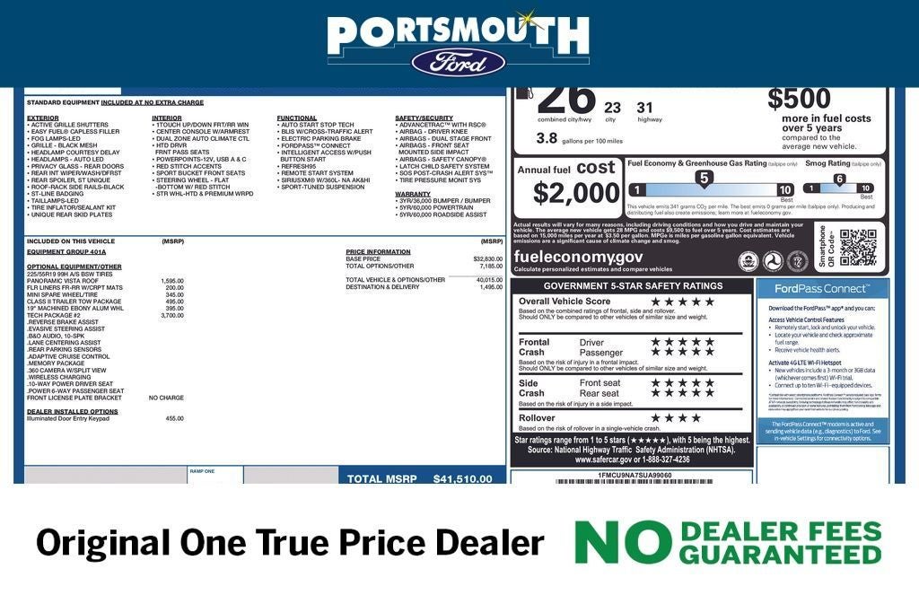 --PORTSMOUTH FORD ADVANTAGE BENEFITS --6 MONTH/7,500 MILE COMPREHENSIVE WARRANTY --WINDSHIELD REPAIR --COSMETIC WHEEL REPAIR --ROAD HAZARD PROTECTION --ROADSIDE ASSISTANCE --KEY REPLACEMENT --PAINT LESS DENT REPAIR --72 HOUR EXCHANGE POLICY (MAX 300 MILES ) PORTSMOUTH FORD HAS BEEN THE ORIGINAL ONE TRUE PRICE DEALER SINCE 1992, WHILE NEVER CHARGING ANY DEALER, DOCUMENTATION OR PREPARATION FEES GUARANTEED.